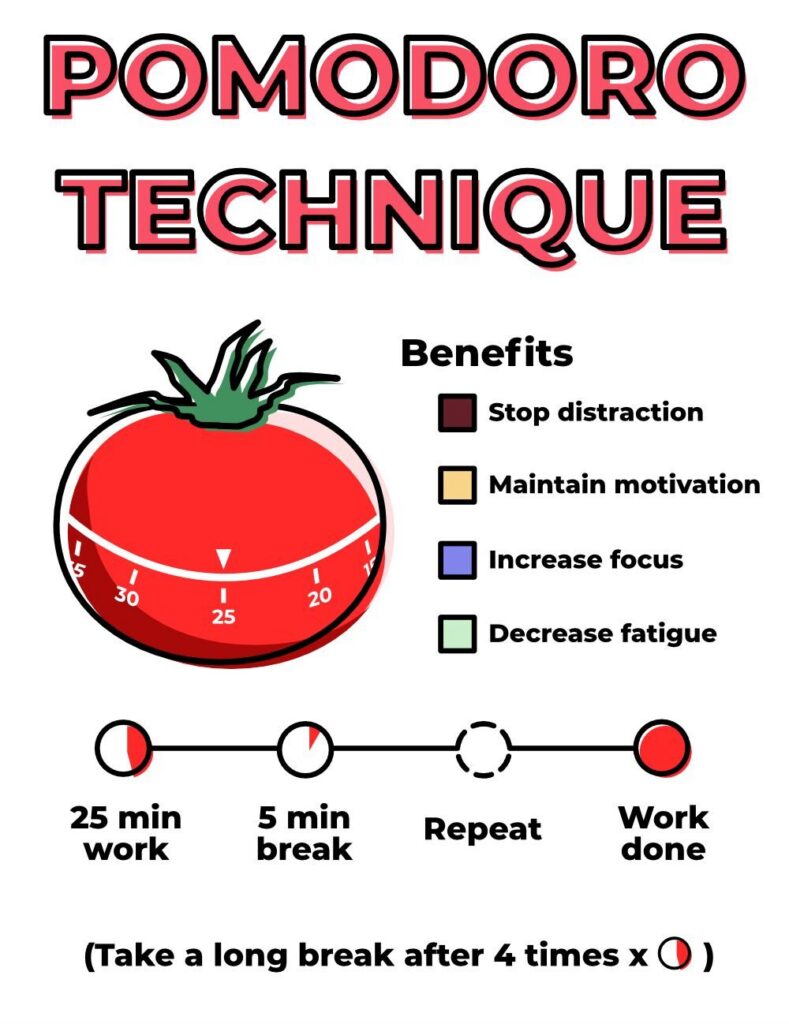 البومودورو تكنيك تعاون برشا الطلبة باش يركزوا أكثر و يلقاو دافع للمراجعة. الفكرة بسيطة: تقرا 25 دقيقة بتركيز، وبعد ترتاح 5 دقايق. هكّا، مخّك ما يتعبش وتلقى روحك ديما متشجع باش تكمّل. الطريقة هاذي تعلّمك كيفاش تنظّم وقتك، تنحي البخل و تبدا وقت التايمر يبدا. وبالراحة الصغيرة بين كل دورة، مخّك يلقى فرصة يرتاح وهاكا يولي عندك تركيز أقوى مع كل مرّة ترجع تقرا