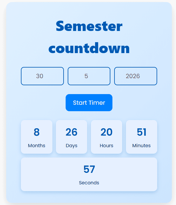 الكاونتداون متاع السميستر يموتيفيك و يخليك تنظم وقتك وتخلي القراية متاعك واضحة قدّامك. كي تشوف النهارات كيفاش تنقص، تحس روحك لازمك تزيد تركّز وتخدم باش ما تتراكمش عليك القراية و الدروس. يعاونك زادا تقسّم المواد والشابيتروات على قداش بقا من وقت، ماغير ما تدخل في ستراس آخر لحظة. ومع الوقت تولي تخدم خطوة بخطوة، وتلقى روحك محضّر مليح وقت الامتحانات