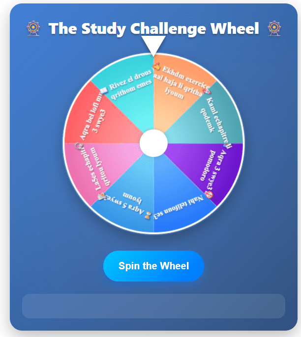كل ما تحس بروحك باخل و معينكش في قراية جرب دور العجلة متع التشالنجز و يجيك تشالنج تعملو يحفزك و يشجعك و يعطيك شعور الإنجاز و هكا تلقا روحك تقرى و انت عامل جو. الإنجاز و التحفيز يجيو مالحاجات الصغار البسيطة إلي تعملهم. التشالنج هذا عبارة على تحدي بيناتك و بينات روحك و الهدف متاعو إنّو يشجعك